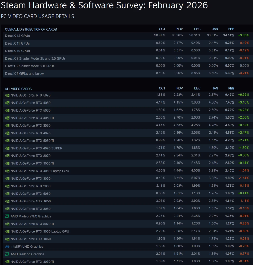 According to the Steam Hardware Survey of February 2026, only 0.25% of their population of gamers had this card whereas the cards in the top 20 all hovered over 1%.